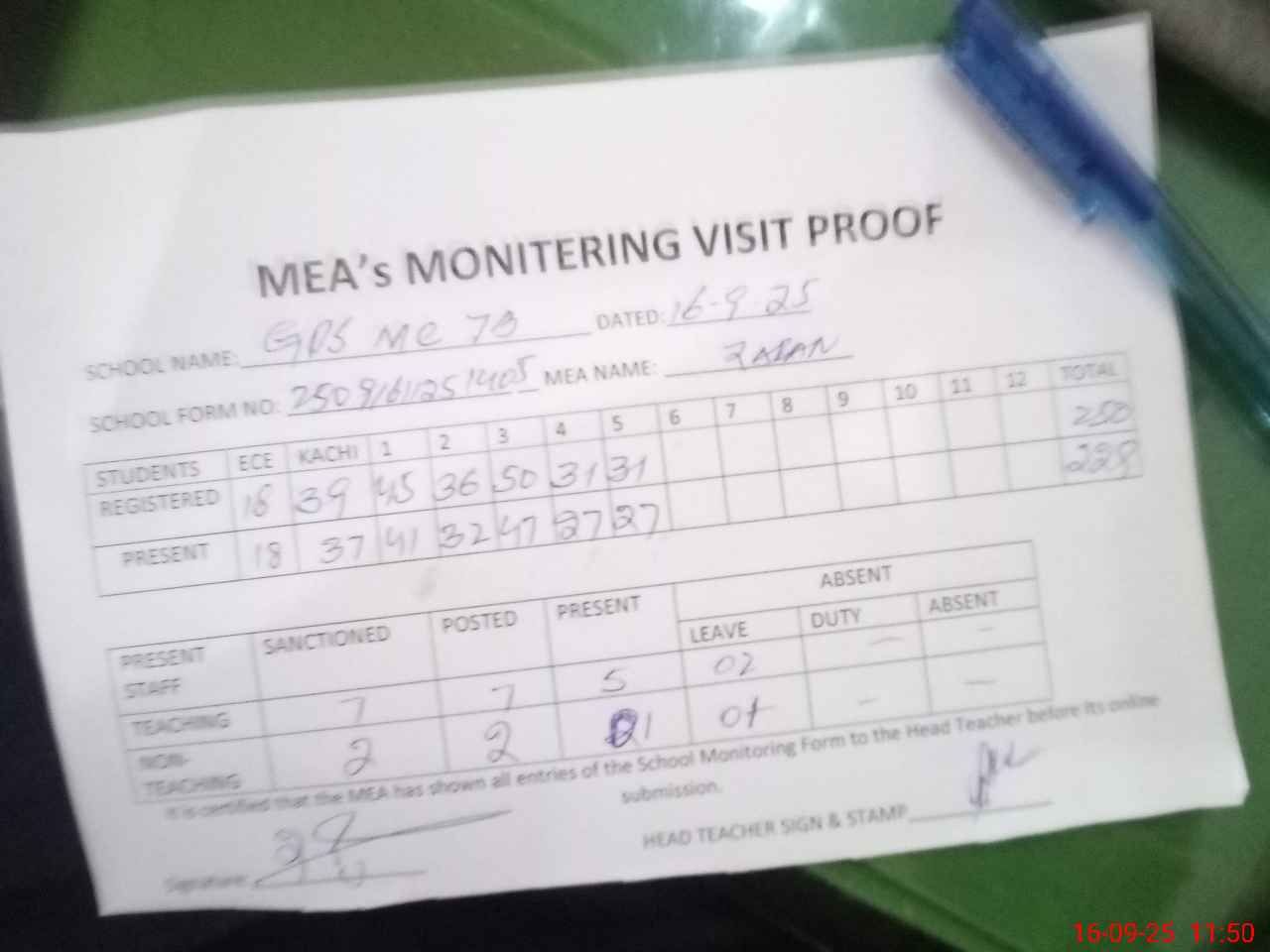 | Attendance Register | Head Teacher | MEA with School | Visit Proof |