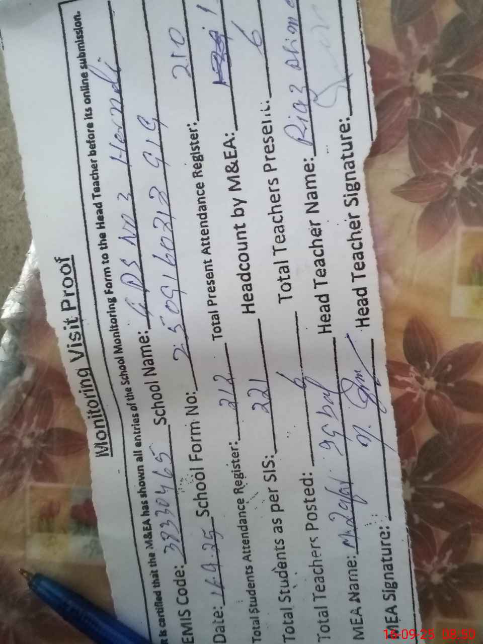 | Attendance Register | Head Teacher | MEA with School | Visit Proof |