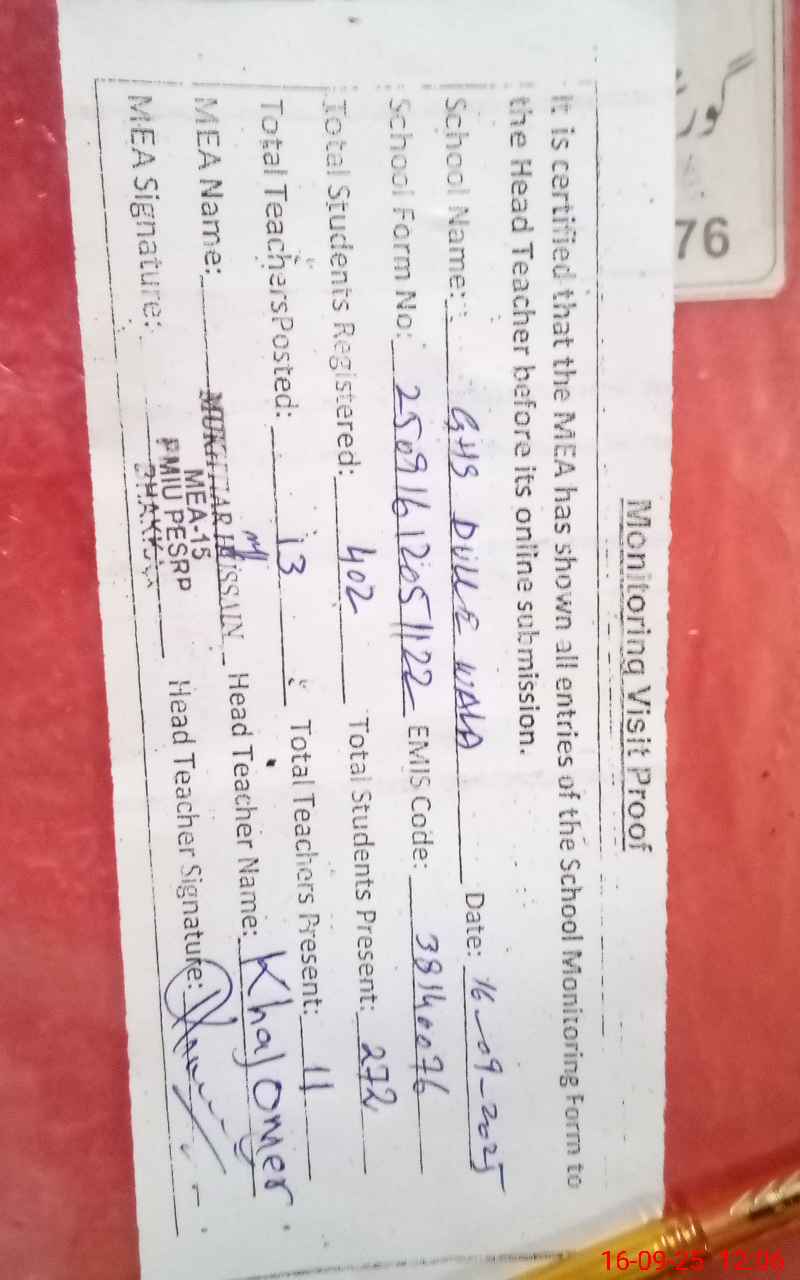 | EMIS Code: 38140076 | Name of School: GHS DULLE WALA | |||