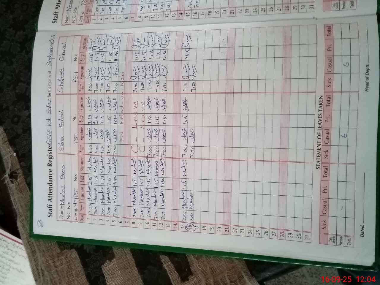 | CNIC | Full Name | Designation | R/C | Absence During Last Calender Month |
