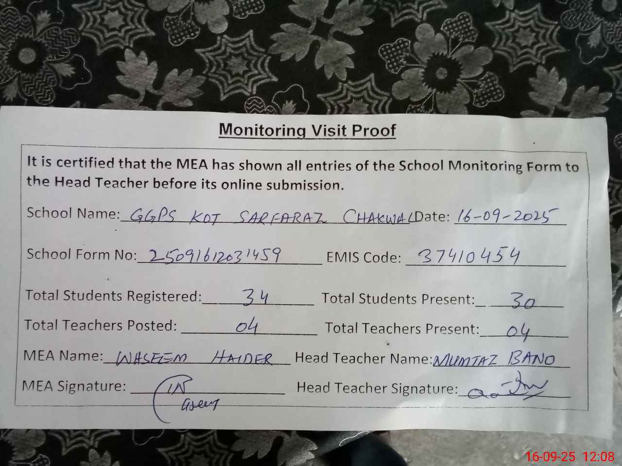 | EMIS Code: 37410454 | Name of School: GGPS KOT SAR FARAZ, CHAKWAL | |||