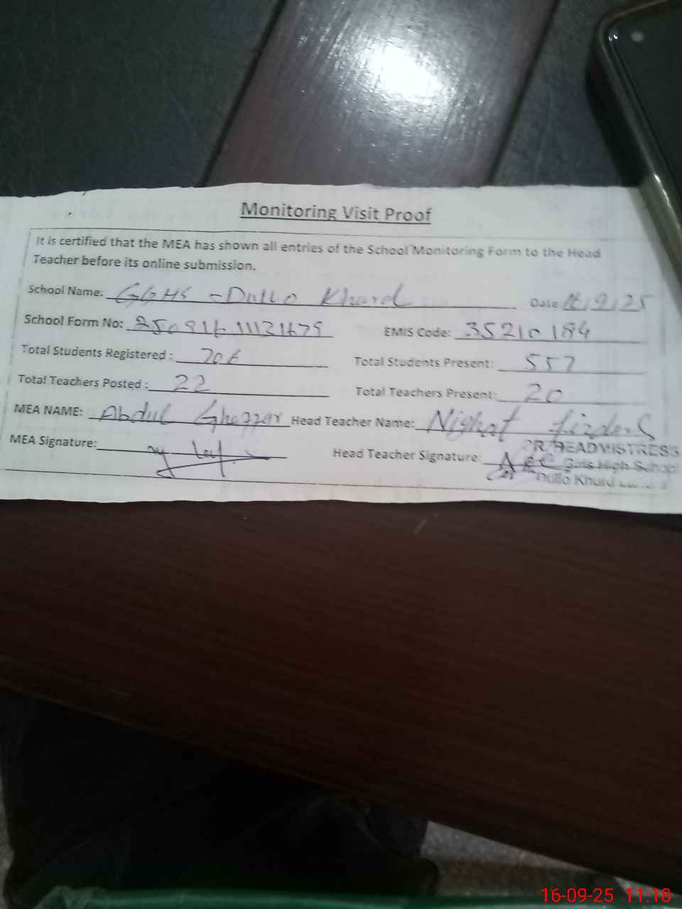 | Attendance Register | Head Teacher | MEA with School | Visit Proof |