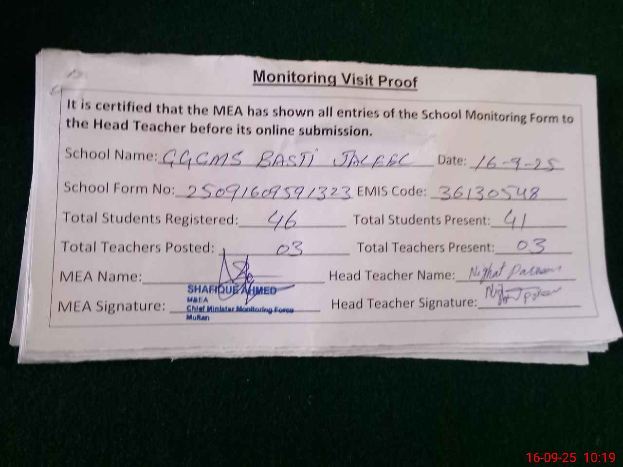 | Certified that this School was Inspected by the Undersigned MEA/DMO Today and the Information Stated Above is as Per Record. | |||||