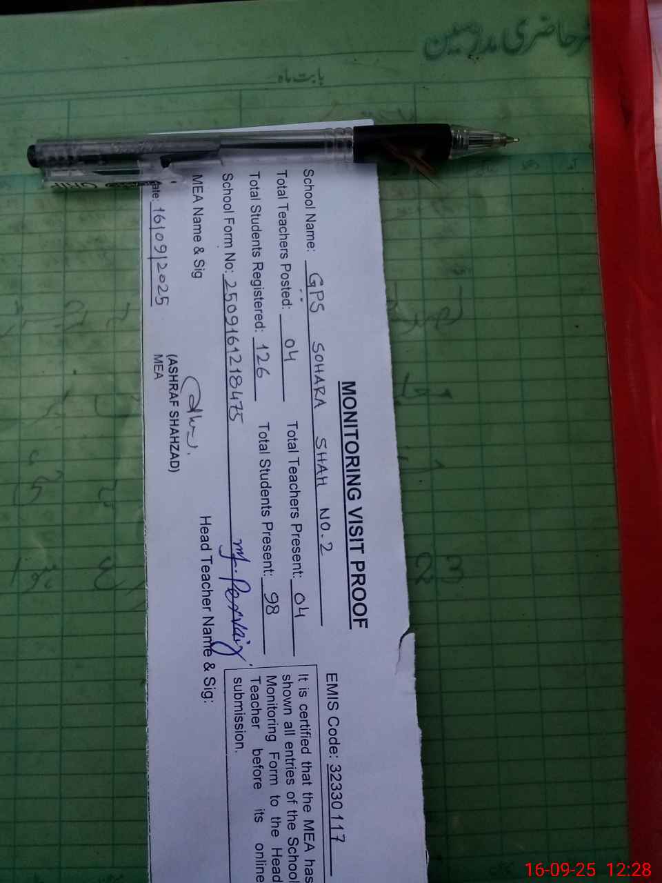 | Attendance Register | Head Teacher | MEA with School | Visit Proof |