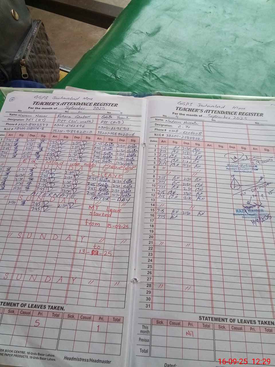 | CNIC | Full Name | Designation | R/C | Absence During Last Calender Month |