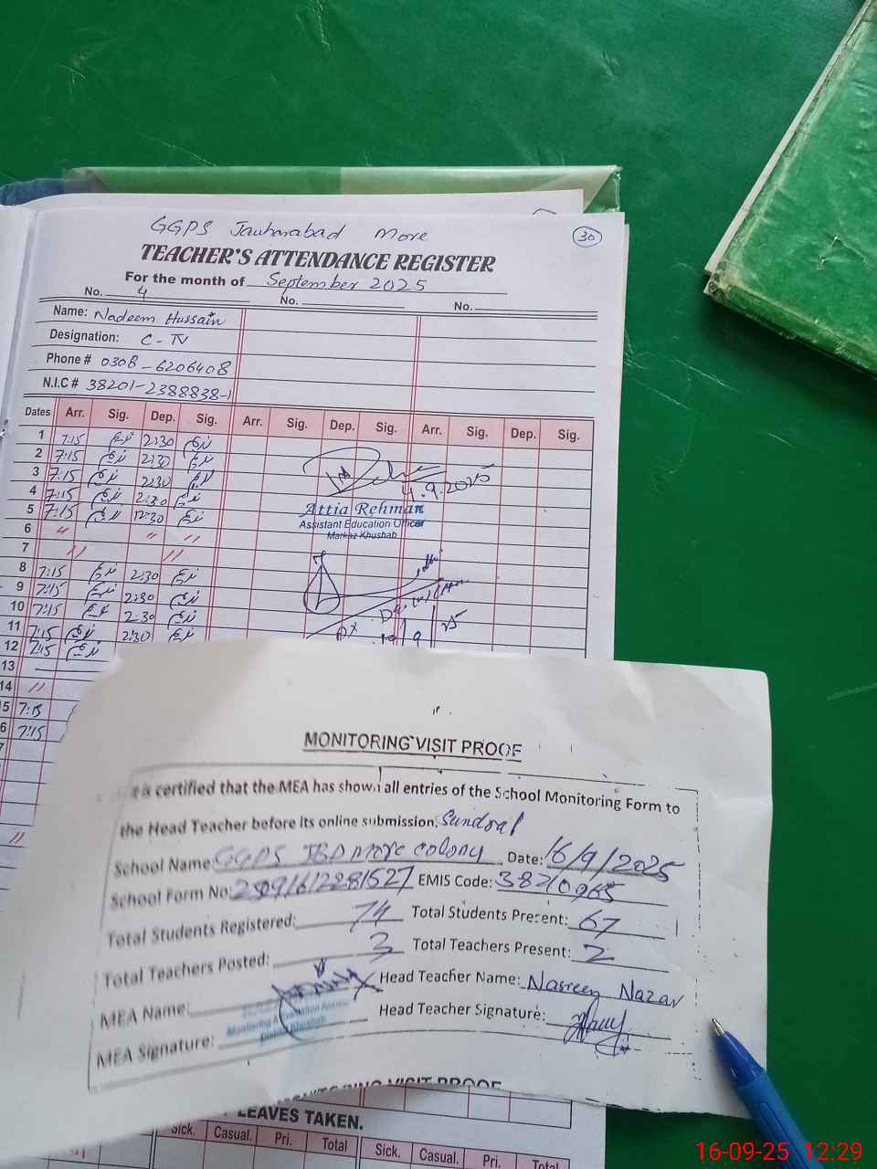 | Attendance Register | Head Teacher | MEA with School | Visit Proof |