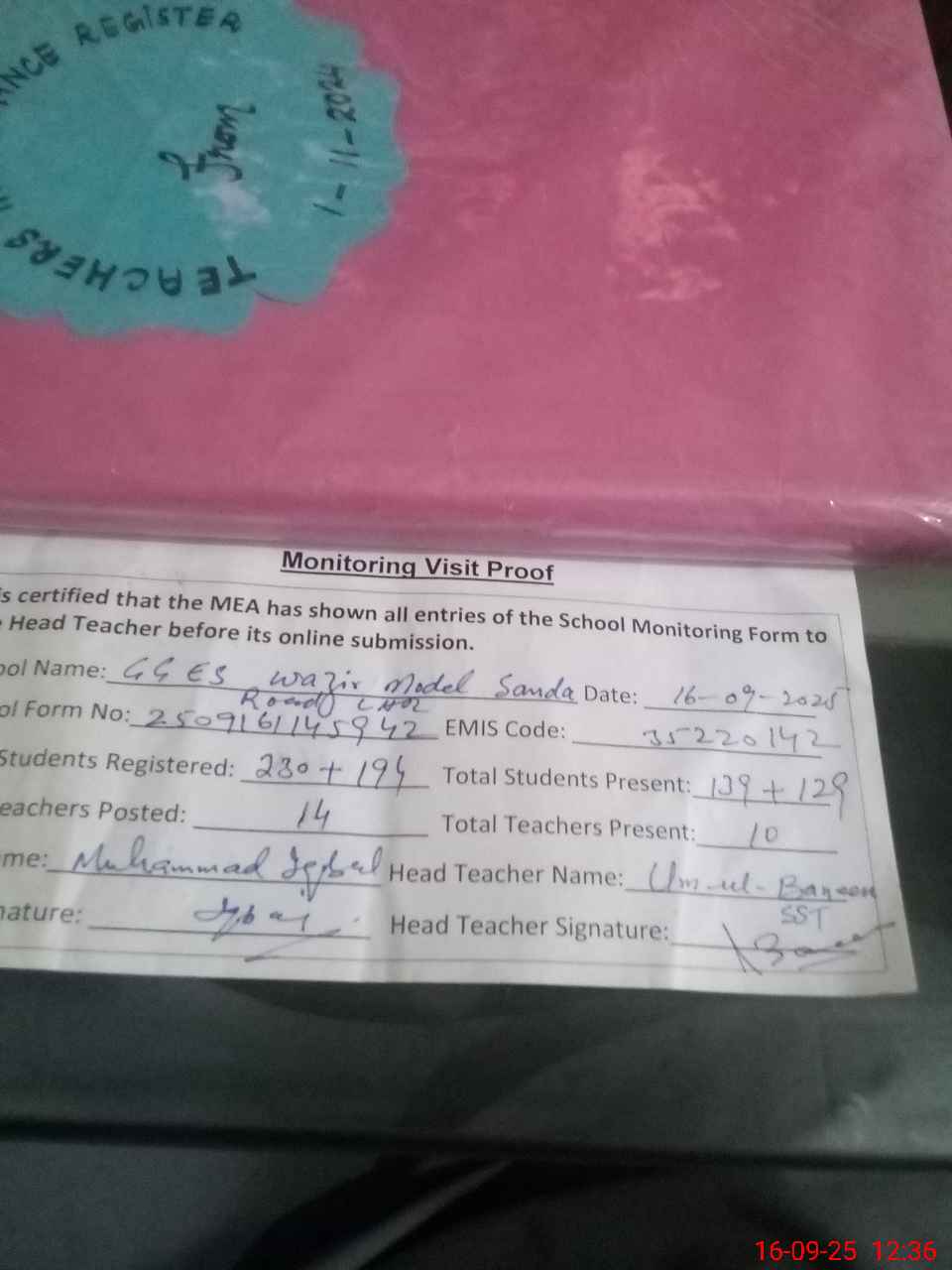 | Attendance Register | Head Teacher | MEA with School | Visit Proof |
