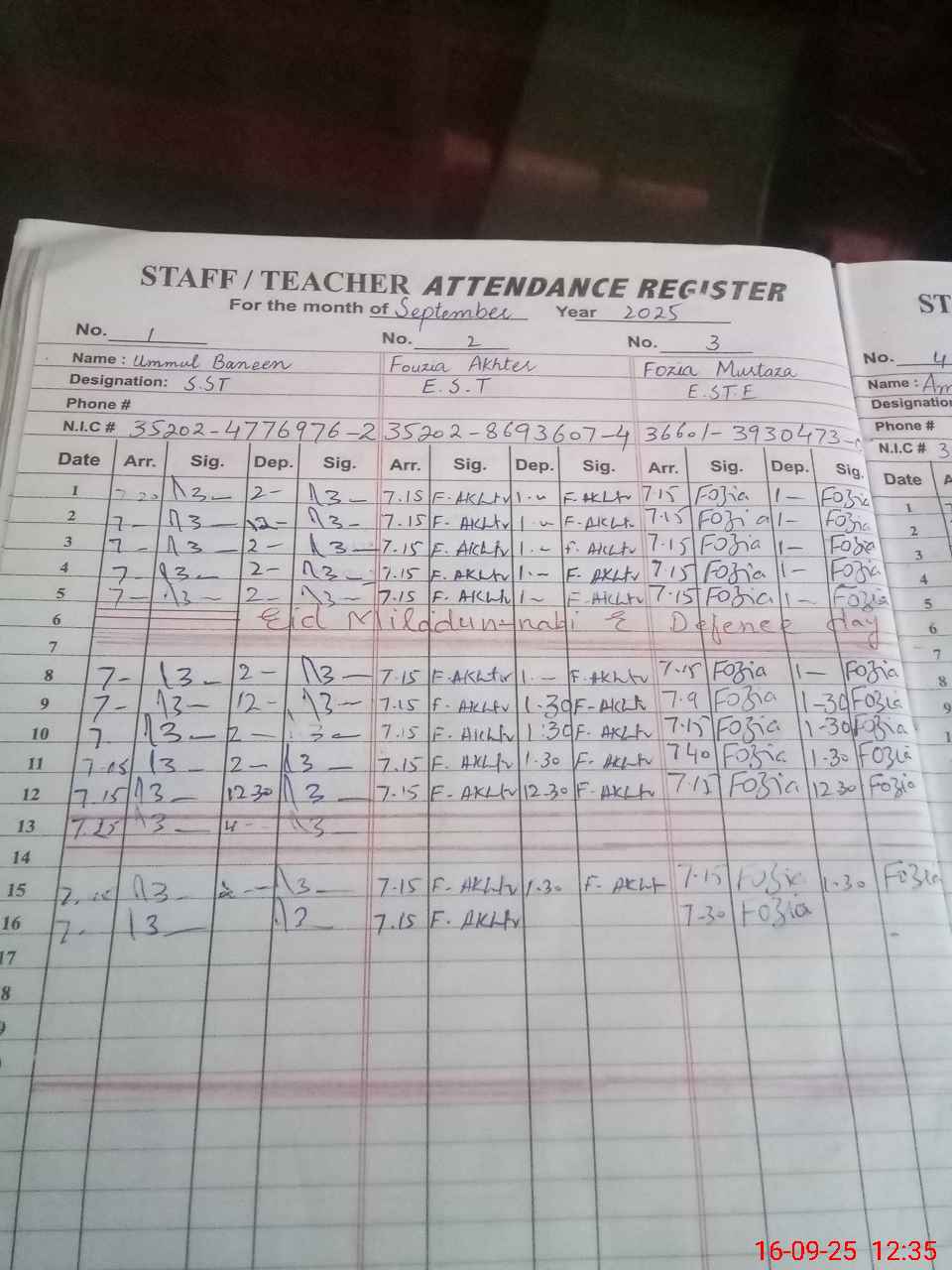 | CNIC | Full Name | Designation | R/C | Absence During Last Calender Month |