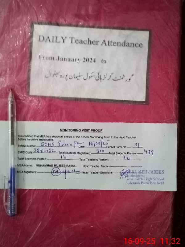 | Attendance Register | Head Teacher | MEA with School | Visit Proof |