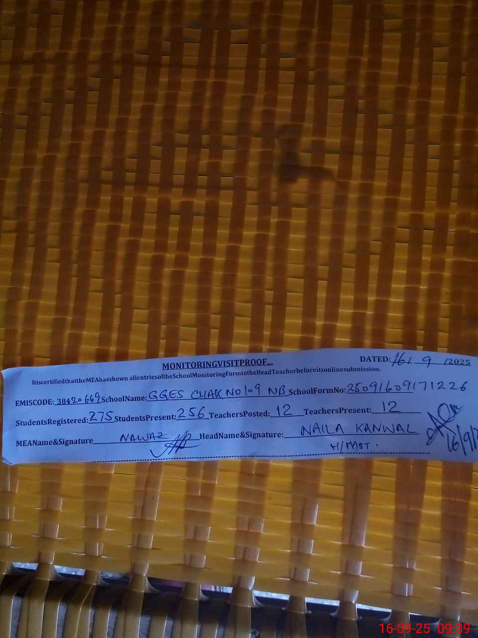 | Certified that this School was Inspected by the Undersigned MEA/DMO Today and the Information Stated Above is as Per Record. | |||||
