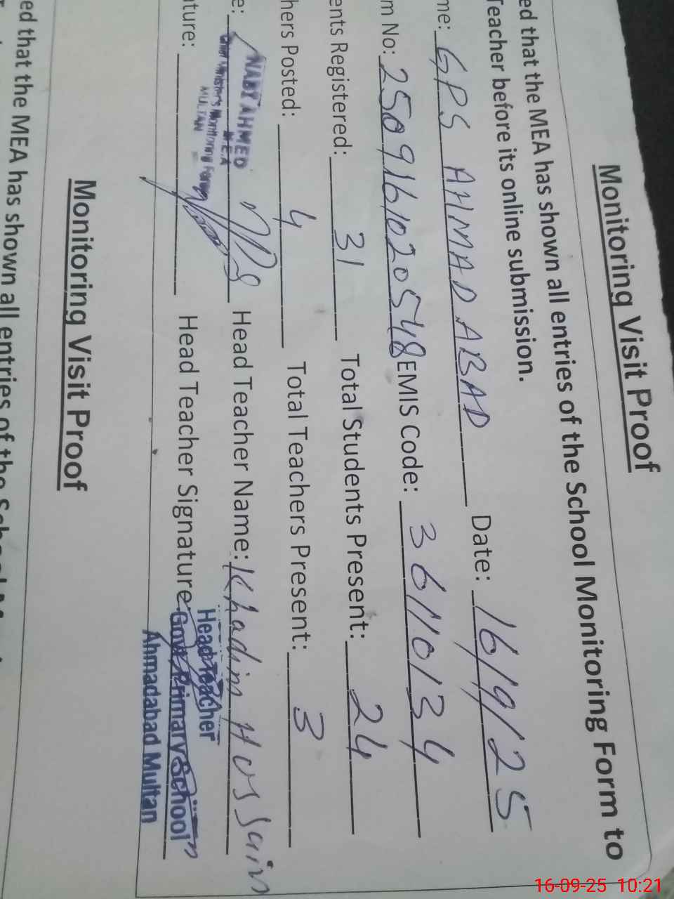 | EMIS Code: 36110134 | Name of School: GPS AHMED ABAD | |||
