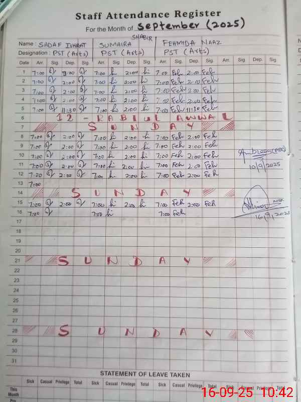 | Name: SA**** IS**** Designation: (School Headmaster's/Headmistress's) Headmistress Phone/Cell Number: 03**** |