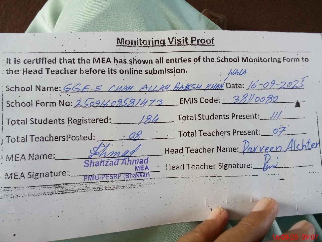 | Attendance Register | Head Teacher | MEA with School | Visit Proof |
