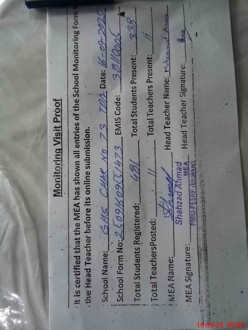| Certified that this School was Inspected by the Undersigned MEA/DMO Today and the Information Stated Above is as Per Record. | |||||