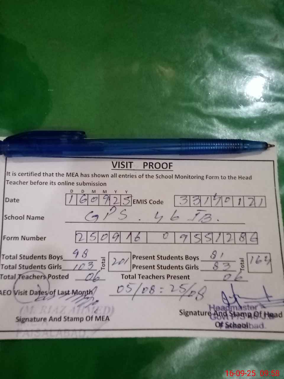 | Attendance Register | Head Teacher | MEA with School | Visit Proof |