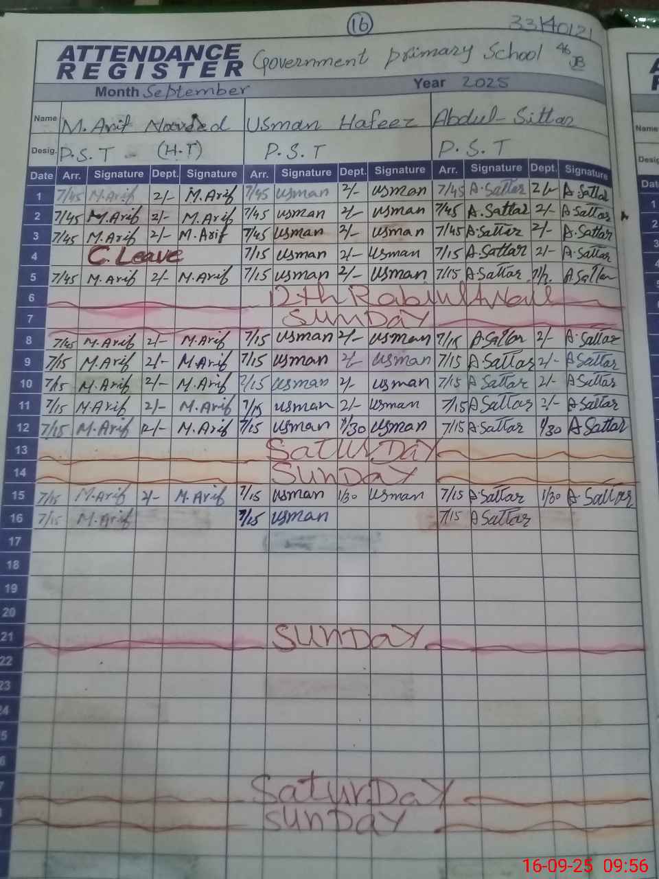 | CNIC | Full Name | Designation | R/C | Absence During Last Calender Month |
