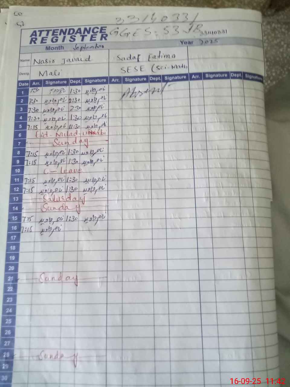| 32**** | Sa**** Fa**** | Contract | 0 | 31 | 0 | 0 | 0 | 0 | 0 | 0 | 0 | Absent (Un-Authorized) | |