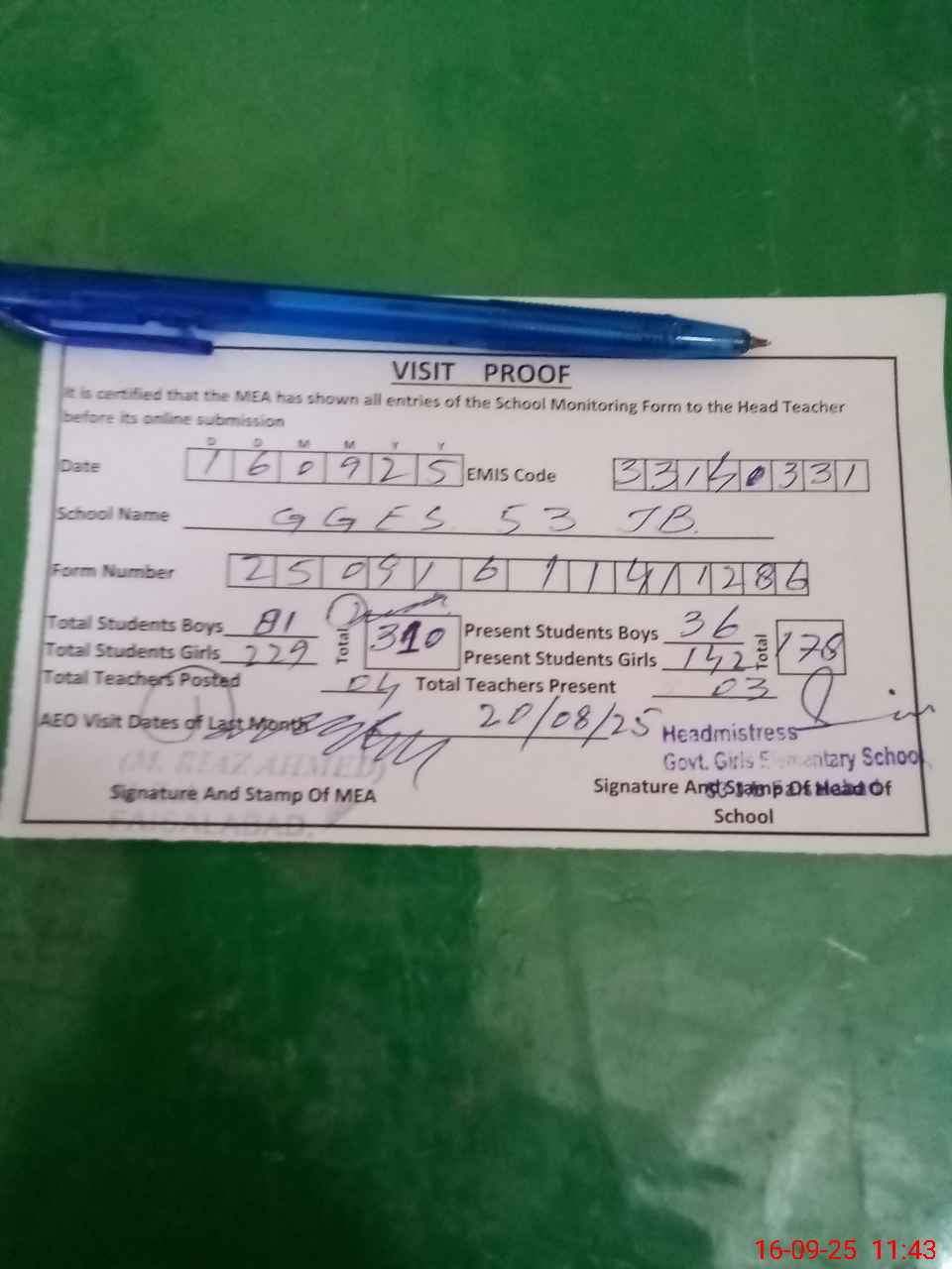 | Attendance Register | Head Teacher | MEA with School | Visit Proof |