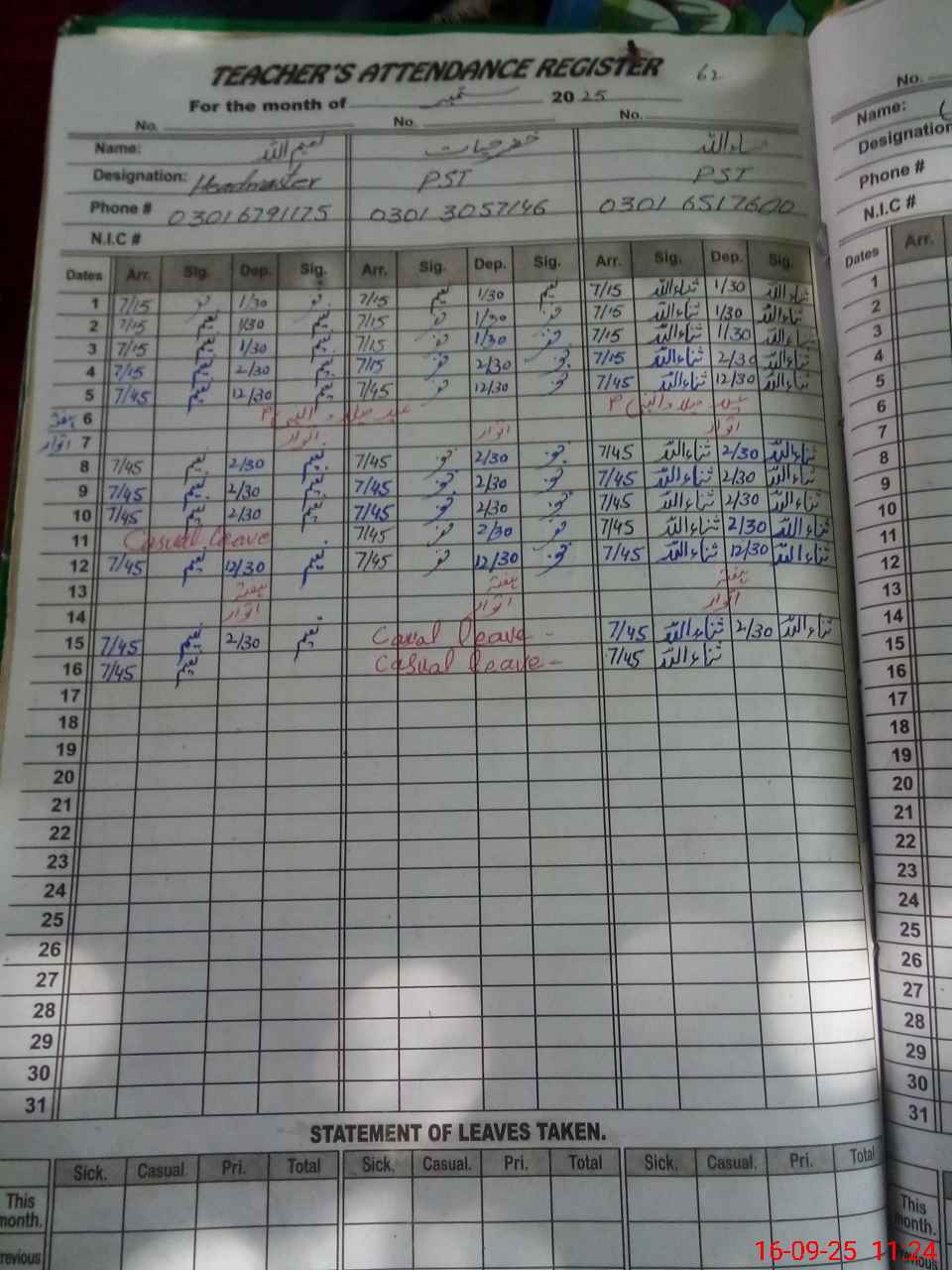| CNIC | Full Name | Designation | R/C | Absence during last cal. month |