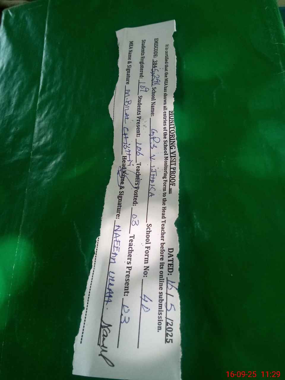 | Attendance Register | Head Teacher | MEA with School | Visit Proof |