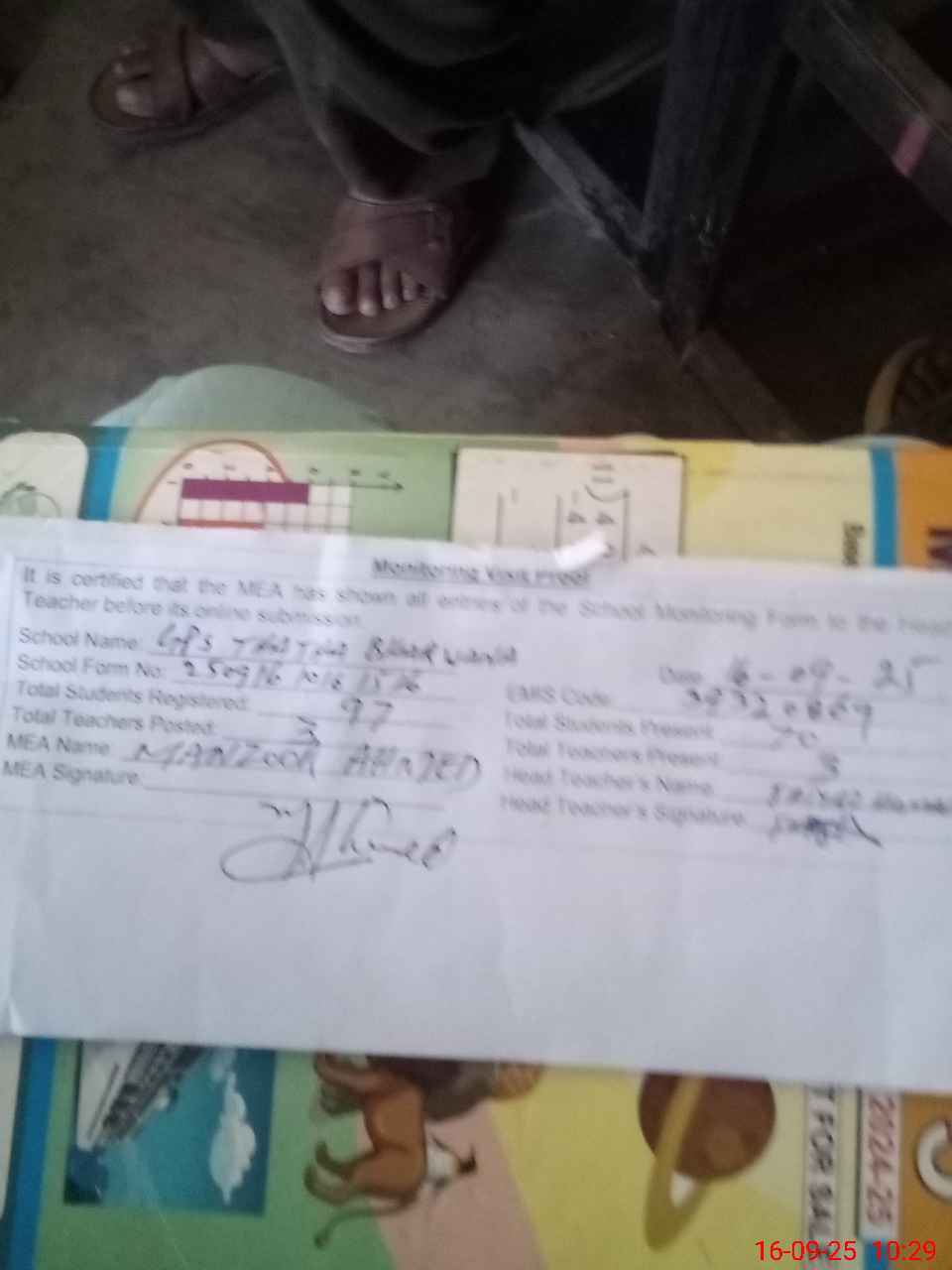 | Attendance Register | Head Teacher | MEA with School | Visit Proof |
