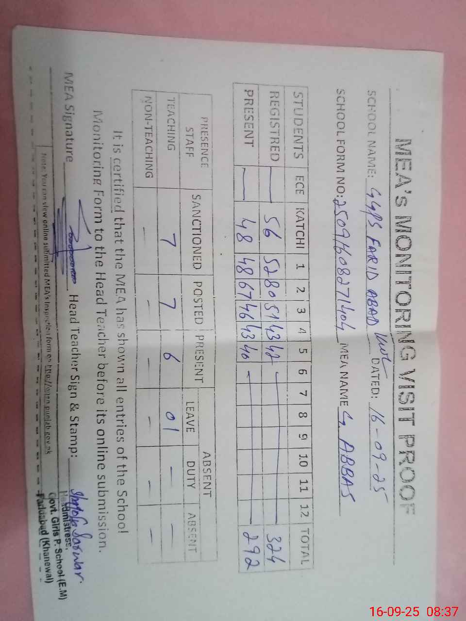 | EMIS Code: 36420354 | Name of School: GGPS FARID ABAD, KHANEWAL | |||