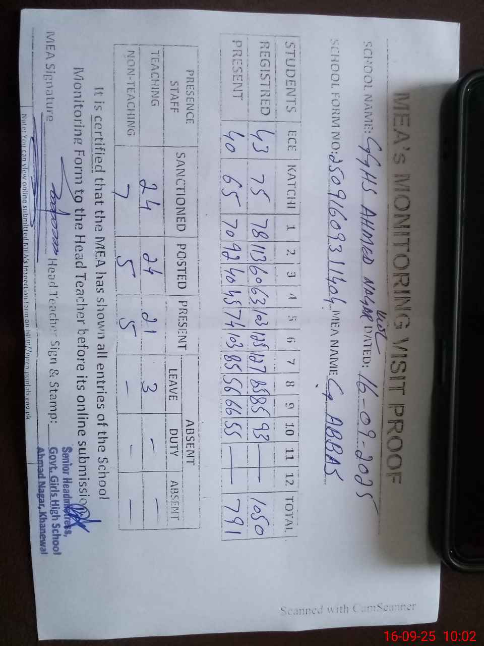| Attendance Register | Head Teacher | MEA with School | Visit Proof |