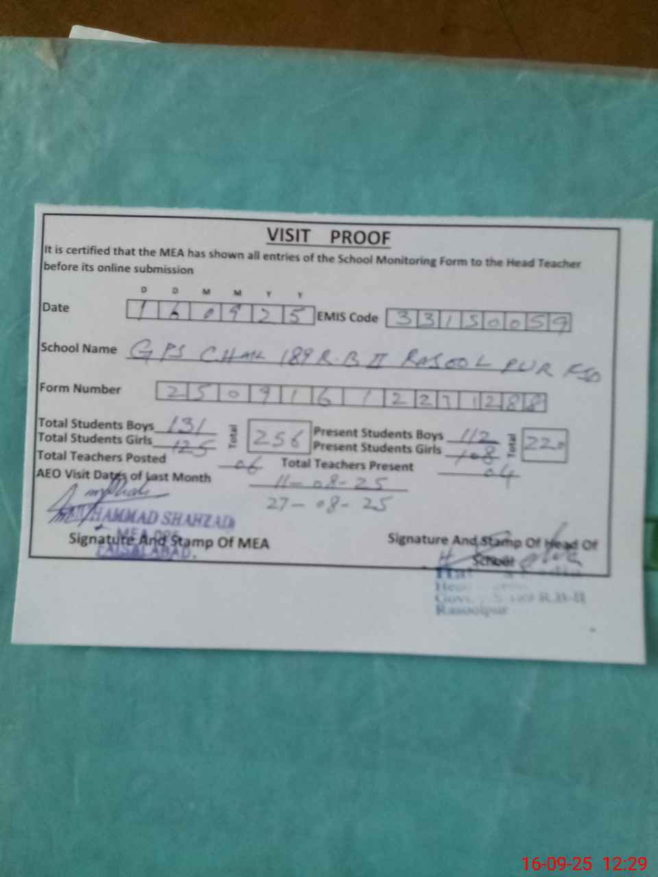 | Attendance Register | Head Teacher | MEA with School | Visit Proof |