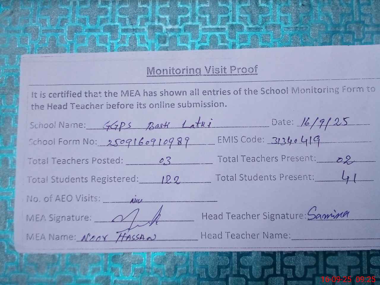 | Attendance Register | Head Teacher | MEA with School | Visit Proof |