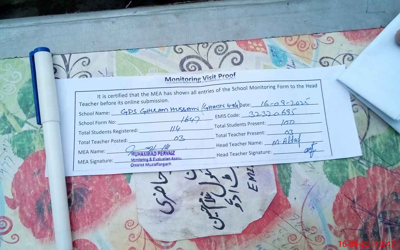 | EMIS Code: 32320695 | Name of School: GPS GHULAM HUSSAIN GHAWAN WALA | |||