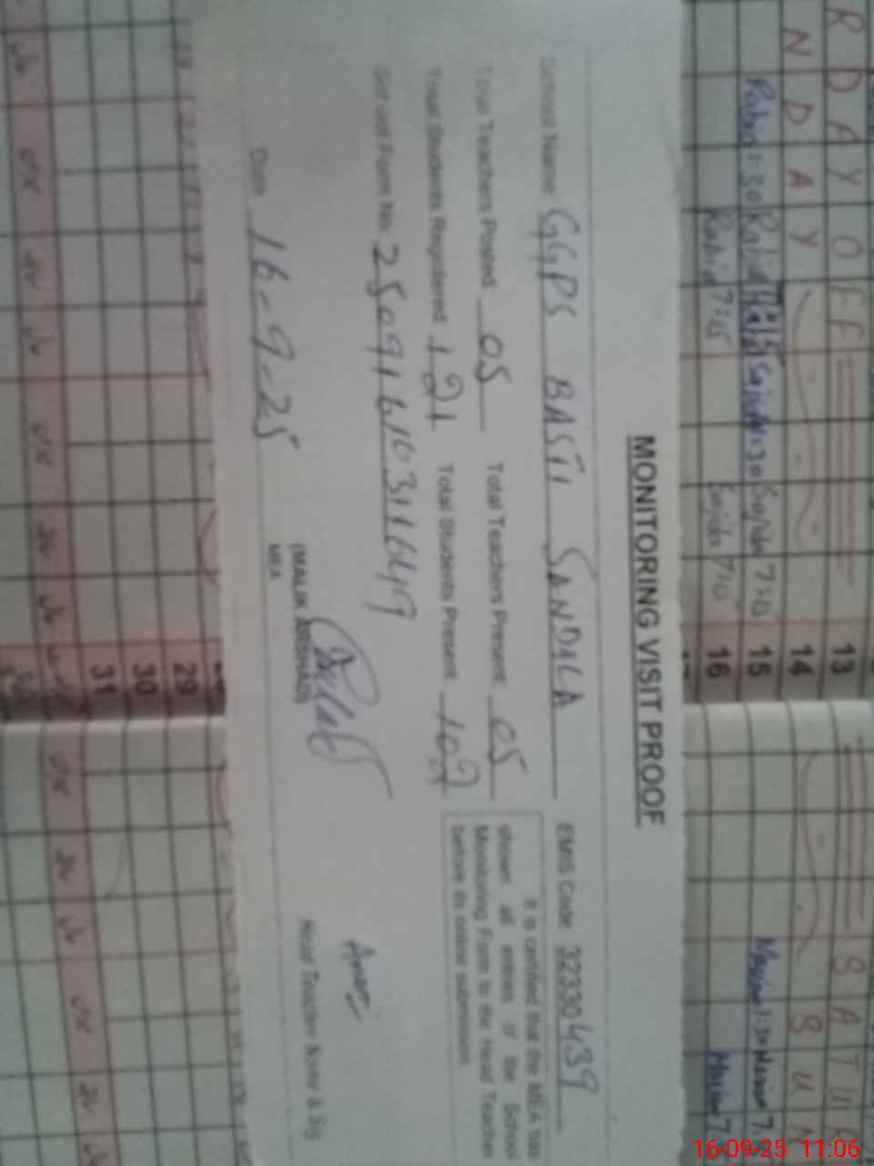 | Attendance Register | Head Teacher | MEA with School | Visit Proof |