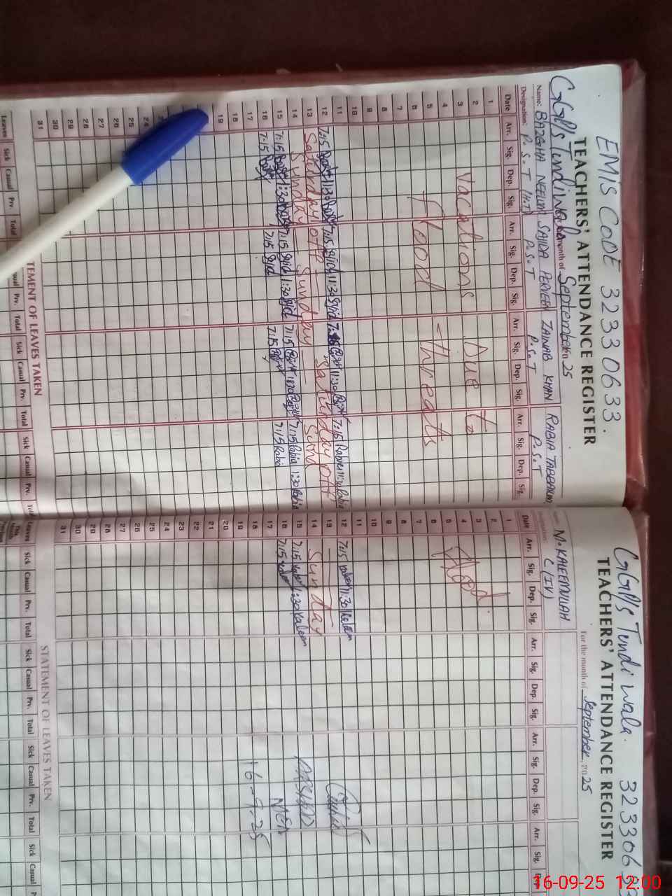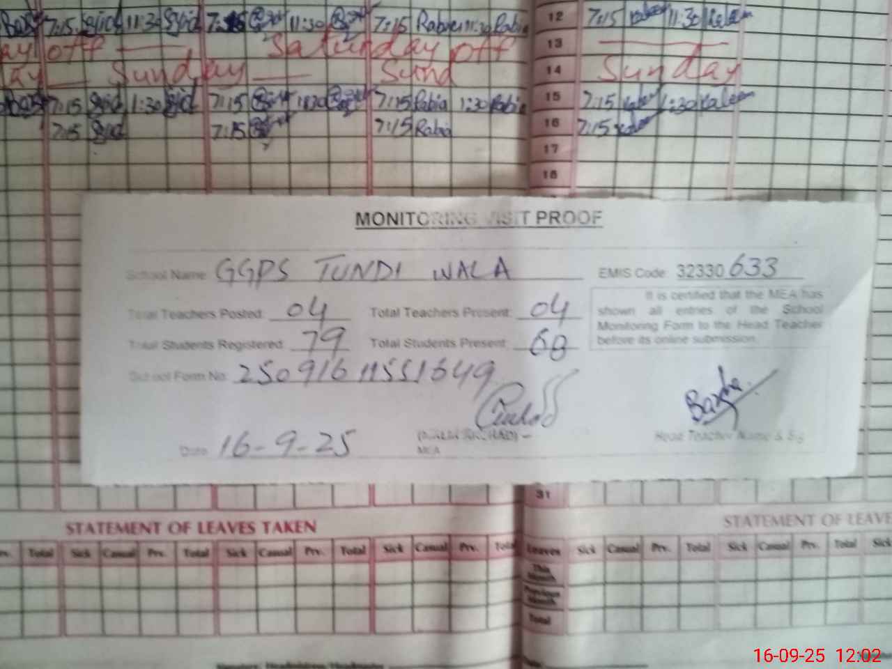 | Attendance Register | Head Teacher | MEA with School | Visit Proof |