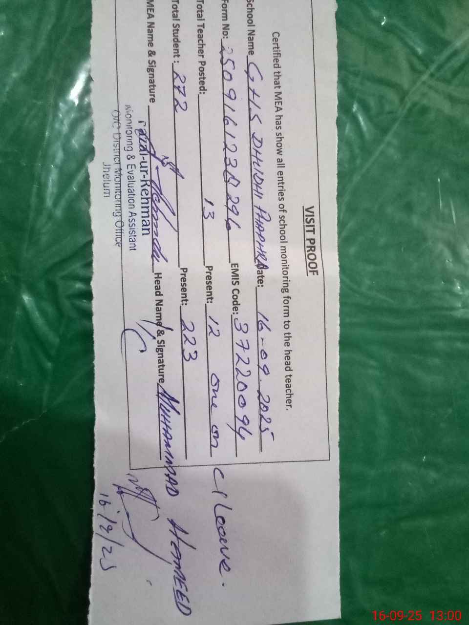 | Attendance Register | Head Teacher | MEA with School | Visit Proof |