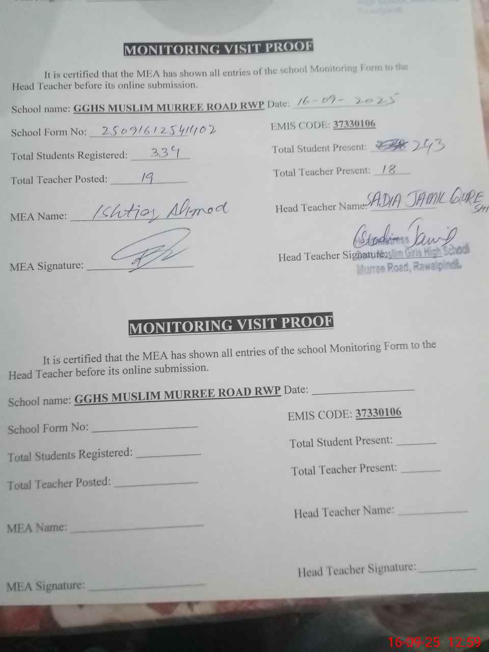 | EMIS Code: 37330106 | Name of School: GGHS MUSLIM MURREE ROAD | |||