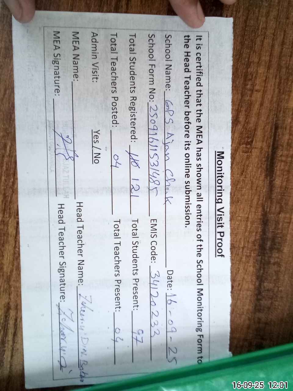 | Attendance Register | Head Teacher | MEA with School | Visit Proof |
