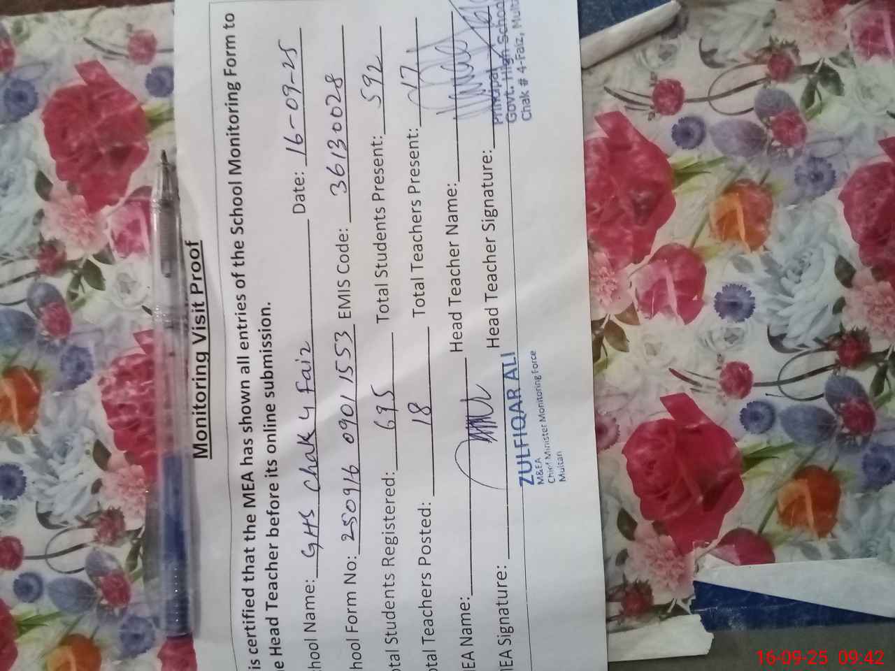 | Attendance Register | Head Teacher | MEA with School | Visit Proof |