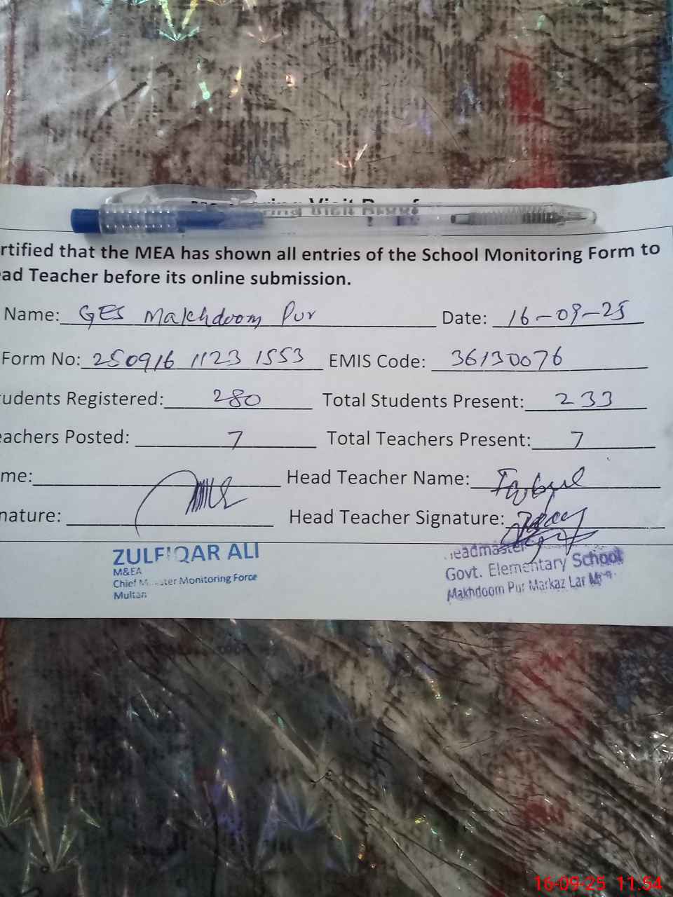 | EMIS Code: 36130076 | Name of School: GES MAKHDOOM PUR | |||