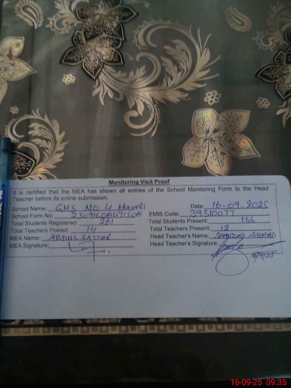 | Certified that this School was Inspected by the Undersigned MEA/DMO Today and the Information Stated Above is as Per Record. | |||||