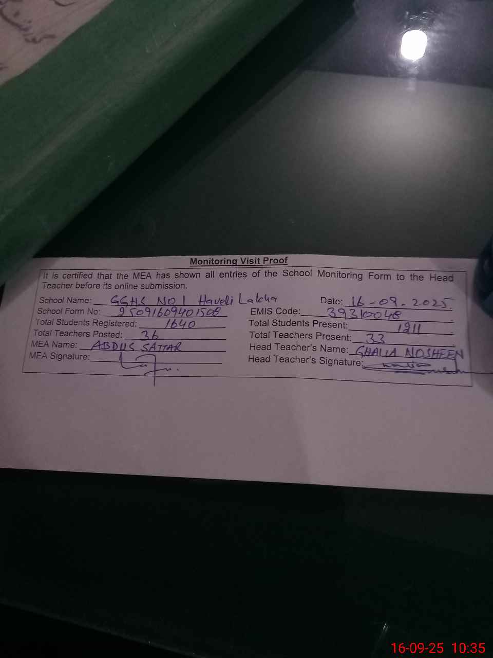 | Certified that this School was Inspected by the Undersigned MEA/DMO Today and the Information Stated Above is as Per Record. | |||||