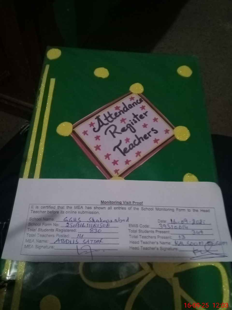 | Attendance Register | Head Teacher | MEA with School | Visit Proof |