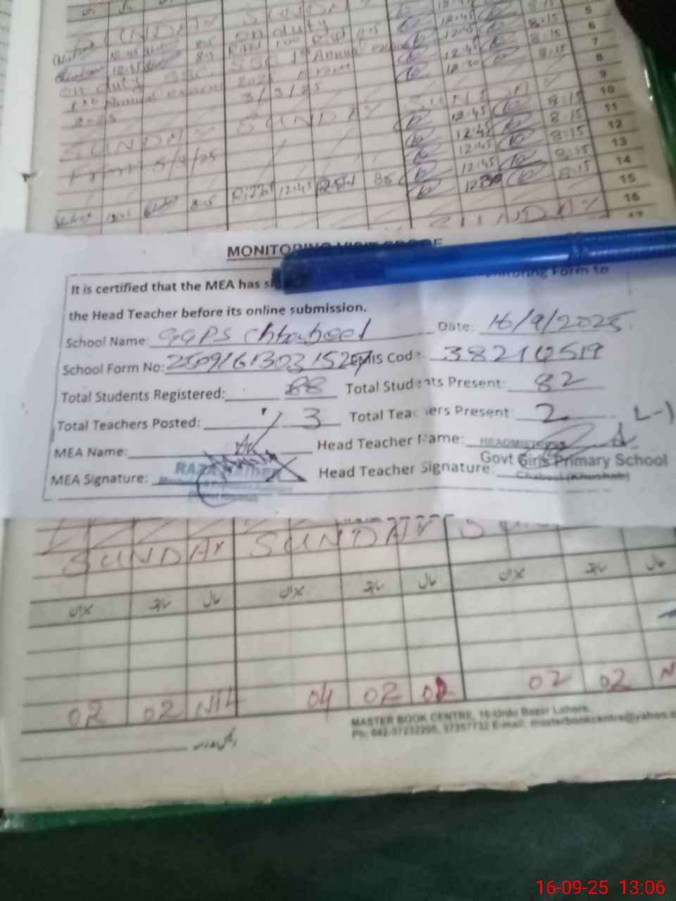 | Attendance Register | Head Teacher | MEA with School | Visit Proof |