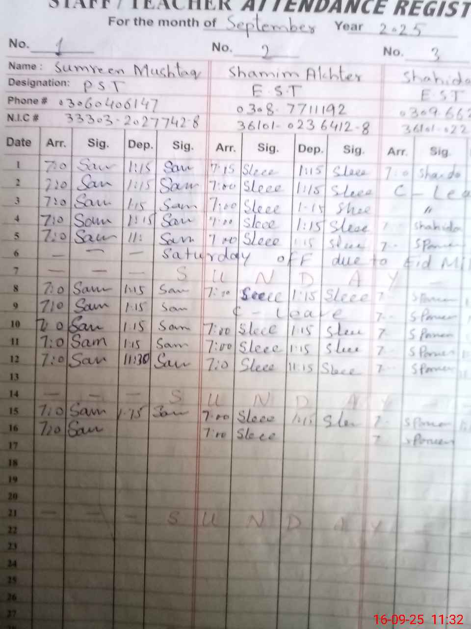 | CNIC | Full Name | Designation | R/C | Absence During Last Calender Month |