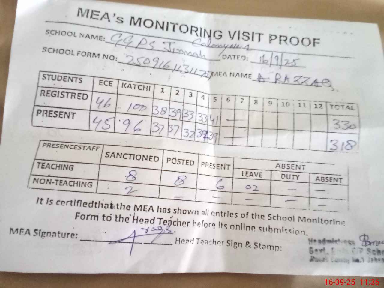 | Attendance Register | Head Teacher | MEA with School | Visit Proof |