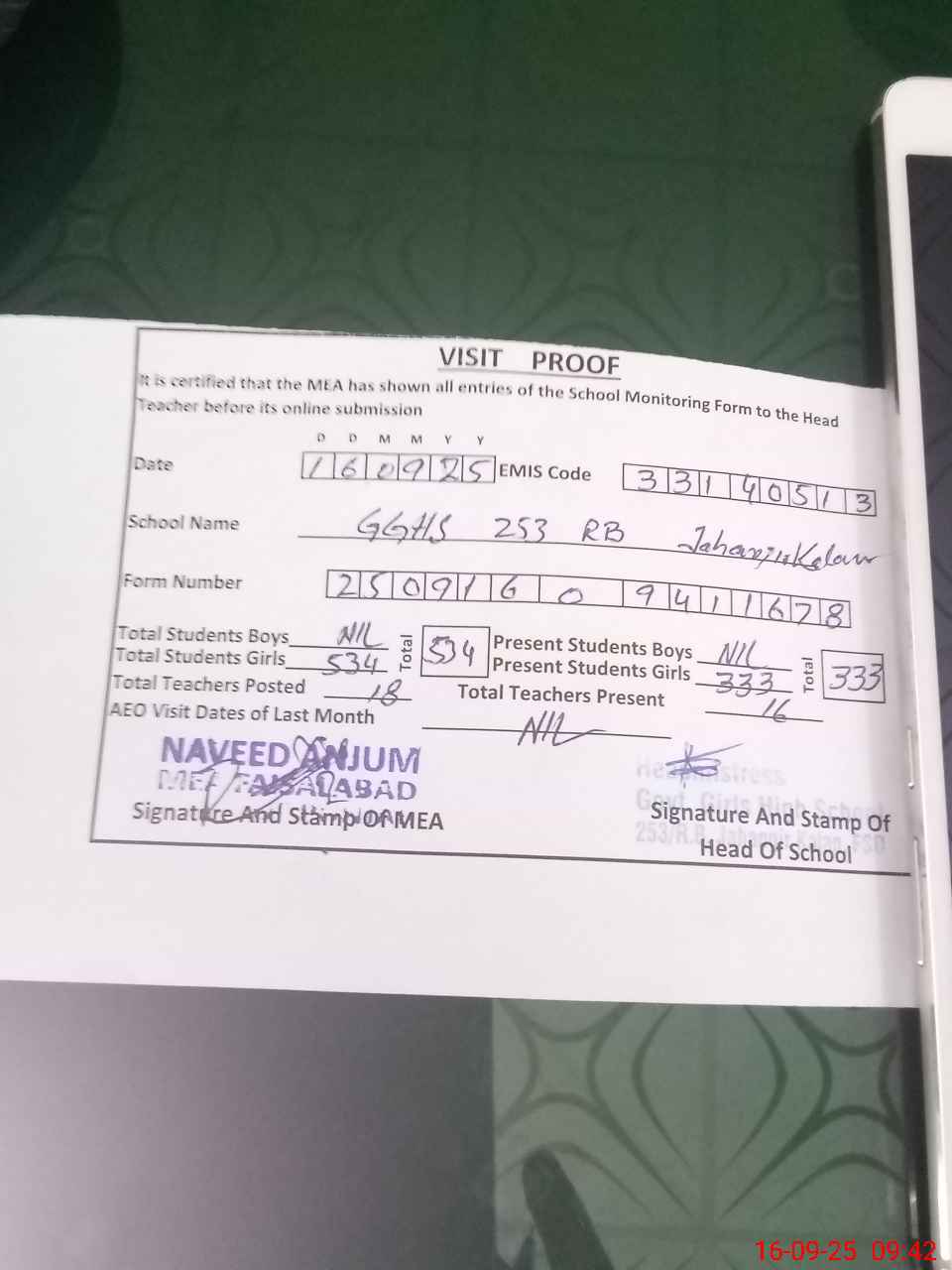 | Attendance Register | Head Teacher | MEA with School | Visit Proof |