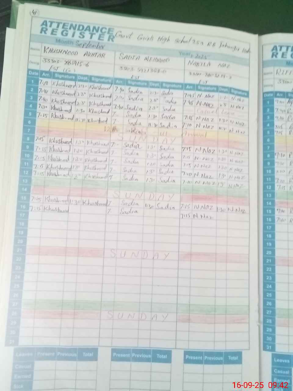 | CNIC | Full Name | Designation | R/C | Absence During Last Calender Month |