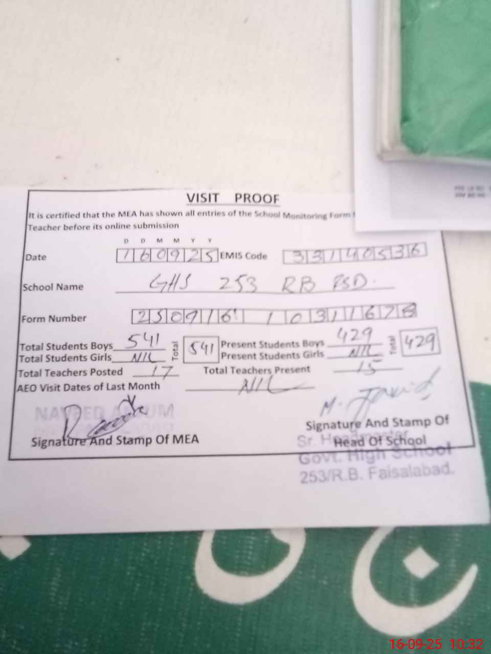 | EMIS Code: 33140536 | Name of School: GHS CHAK 253 RB FSD | |||