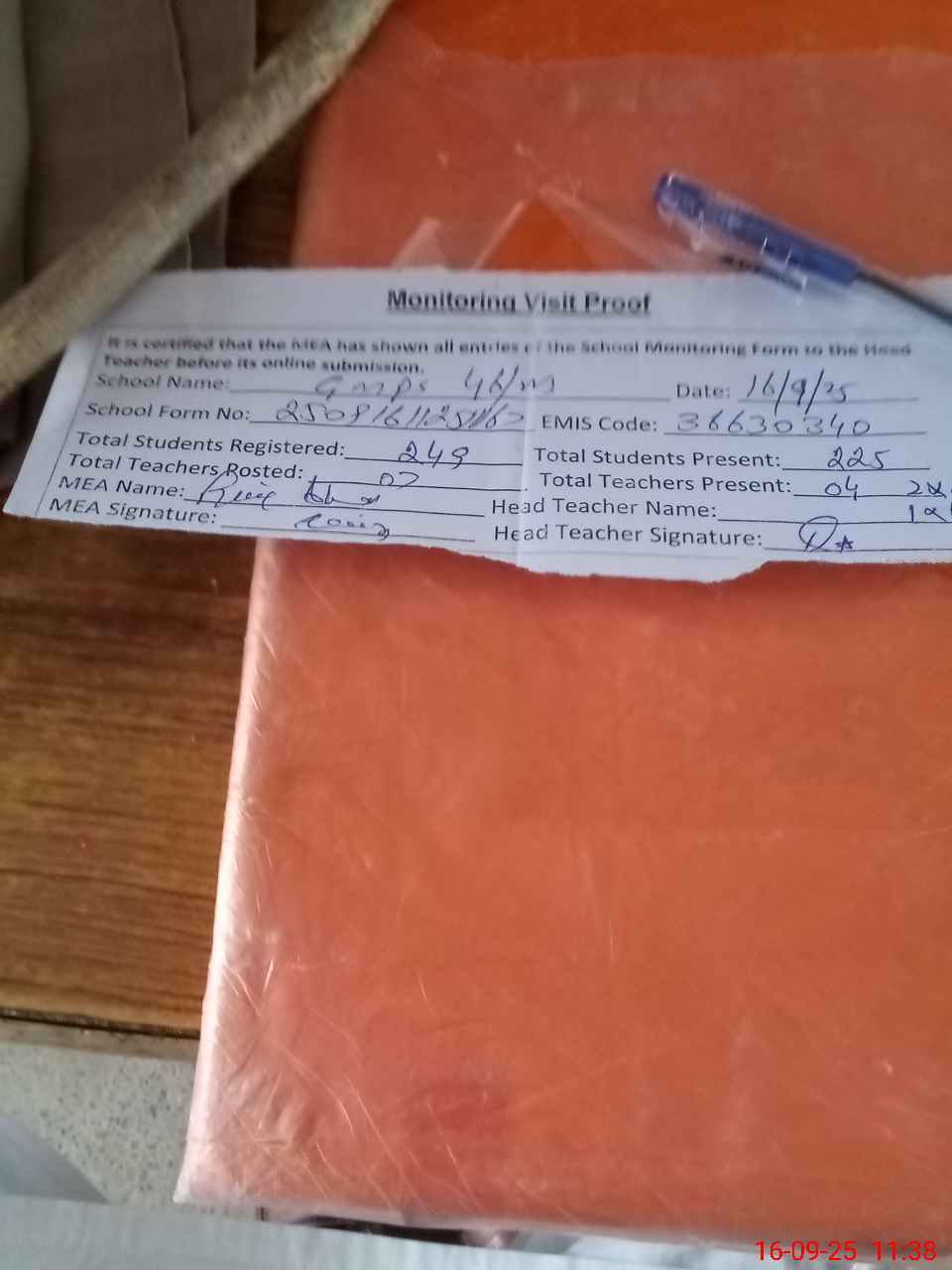 | Attendance Register | Head Teacher | MEA with School | Visit Proof |