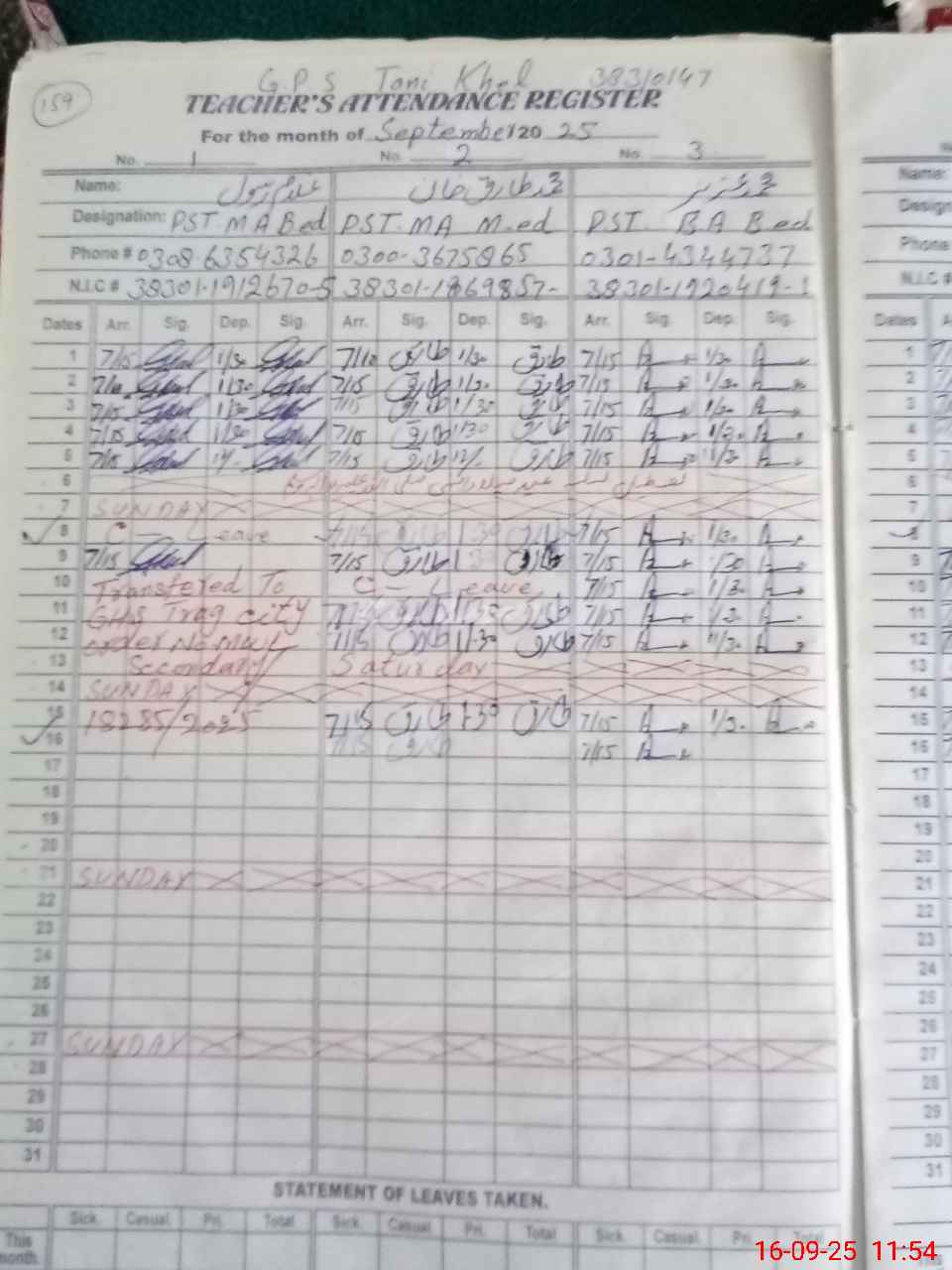 | CNIC | Full Name | Designation | R/C | Absence During Last Calender Month |