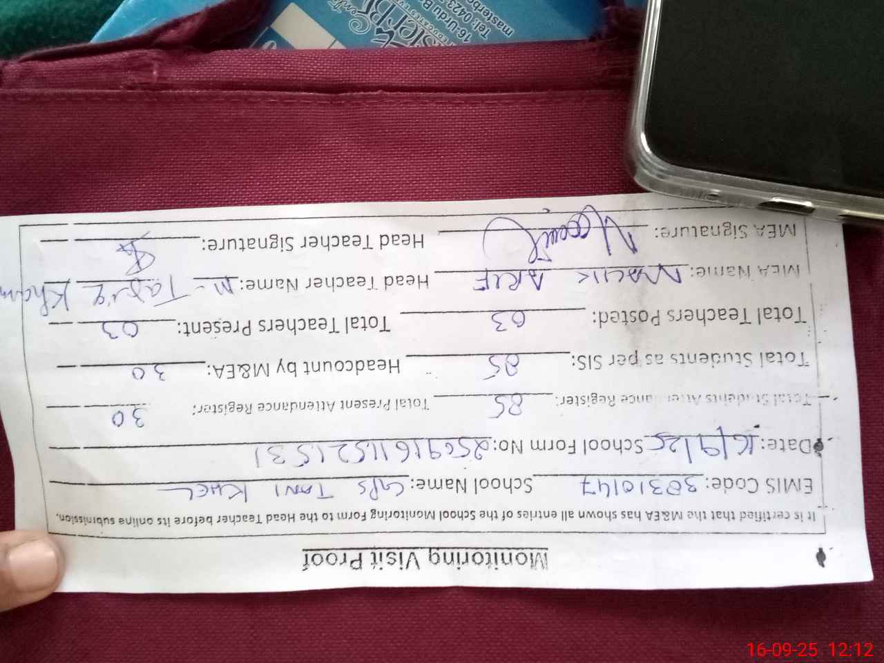 | Attendance Register | Head Teacher | MEA with School | Visit Proof |
