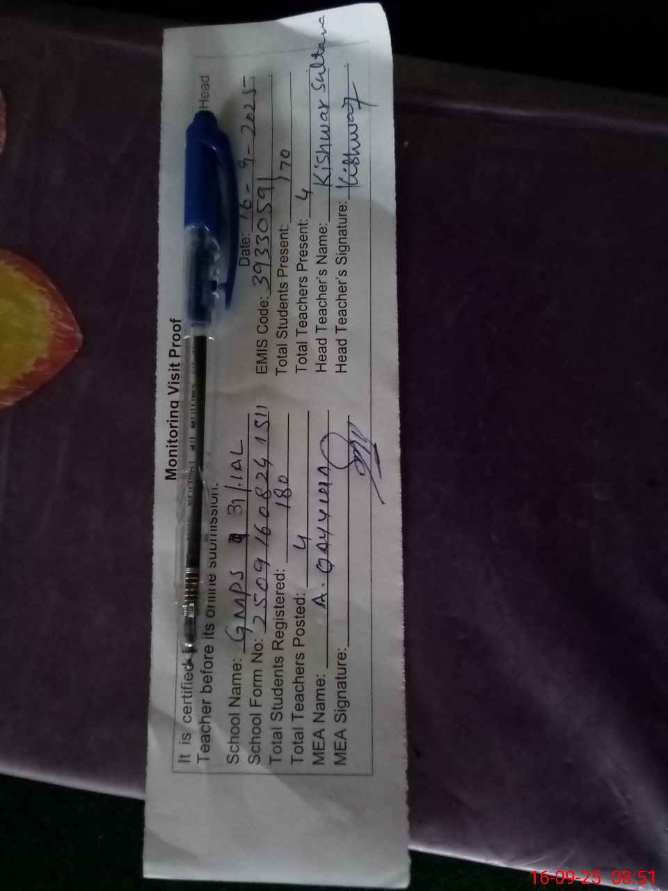 | Attendance Register | Head Teacher | MEA with School | Visit Proof |